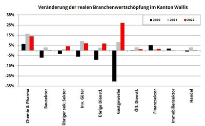 Auch im 2021 sieht sich die Schweizer Wirtschaft mit Einschränkungen gegen die Ausbreitung des Coronavirus konfrontiert. Wegen des Gesundheitspasses beinhalten diese Massnahmen allerdings keine Kontaktverbote oder Geschäftsschliessungen mehr. Die beiden Schwerpunkte der Pandemiebekämpfung liegen diesmal beim Covid-Zertifikat und der Impfung. Dies äussert sich dieses Jahr durch eine positive Entwicklung der Wertschöpfung in allen Branchen im Wallis, insbesondere in der Hotelbranche. Dank der Wiederöffnung der Grenzen und der Wiederaufnahme des Reiseverkehrs verzeichnete die Hotelbranche ein positives Wachstum. Für das Wallis ist der Tourismus in den Bergregionen ein wichtiger Bestandteil der Gesamtwertschöpfung. In der Wintersaison 20/21 konnten die Ferienorte ihre Skigebiete öffnen, wenn auch mit bestimmten Einschränkungen wie die Schliessung der Restaurants. Dieser Entscheid führte dennoch zu einem Rückgang der Skiferienbuchungen ausländischer Touristen. Für die Wintersaison 21/22 sind die Aussichten besser. Aufgrund der aktuellen epidemiologischen Prognosen werden die Bergbahnen ihren Betrieb aufnehmen und die Restaurants Personen mit Covid-Zertifikat empfangen können.