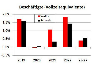 Im vergangenen Jahr verzeichnete die Walliser Wirtschaft ein Minus von 3% und wies damit eine stärkere Abschwächung auf als die Schweiz als Ganzes (CH: -2,4%). Im Gegensatz zum BIP blieb die Beschäftigung im Wallis im Vergleich zur Vorjahresperiode unverändert und lag damit leicht unter dem Durchschnitt (CH: +0,1%).
