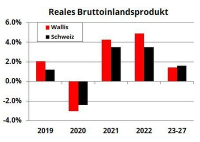BAK Economics erwartet für 2021 ein Wachstum des Walliser BIP von 4,3%, also über dem gesamtschweizerischen Mittel (CH: +3,5%). Dieser positive Trend dürfte sich im Jahr 2022 fortsetzen (Wallis: +4,9% und CH: +3,5%).
