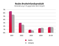 Das reale Walliser BIP wuchs im 2023 weiter und liegt damit über dem Schweizer Durchschnitt (VS: 0,9%, CH: 0,7%). Für das laufende Jahr prognostiziert BAK Economics ein Wachstum der Walliser Wirtschaft von 1,4 Prozent. Damit entwickelt sich die kantonale Wirtschaft ähnlich wie die Gesamtschweiz (CH 2024: 1,5%).