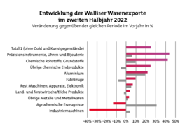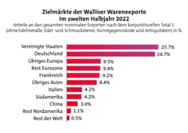 In der zweiten Jahreshälfte 2022 stiegen die Walliser Warenexporte um fast 25% gegenüber der gleichen Periode des Jahres 2021. Allein auf die USA und Deutschland entfällt die Hälfte der Exporte des Kantons. Der Walliser Aussenhandel ist für den asiatischen Markt wieder interessant, ist aber für Nordamerika und Europa weniger dynamisch geworden.
