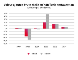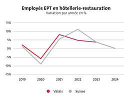 Après une forte reprise en 2022 et 2023, on s'attend également à une croissance de la valeur ajoutée dans l'hôtellerie-restauration en Valais en 2024 (VS:+4,4%, CH : 3,9%). En revanche, une stagnation est prévue pour l'emploi. La croissance attendue est de 0,2% pour l'année 2024 (CH : +0,1%).