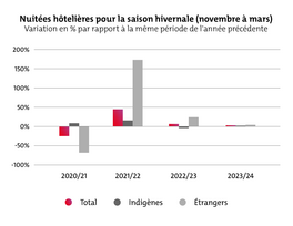Entre novembre 2023 et mars 2024, le canton du Valais a enregistré une hausse des nuitées de 2,5% par rapport à la même période de l'année précédente. La hausse la plus forte a été enregistrée chez les hôtes étrangers (+3,8%). Une hausse a également été observée chez les touristes nationaux, bien que dans une moindre mesure (+1,5%).