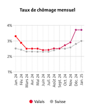 En raison des fortes incertitudes au niveau mondial et de la faiblesse générale du secteur de l'industrie, BAK Economics s'attend à une augmentation du taux de chômage de 2,4% à 2,9% en 2025 dans toute la Suisse. Malgré ces prévisions, le nombre d’emplois en Valais continuera à augmenter légèrement en 2025, mais à un taux nettement inférieur à celui de l'année précédente (0,5% en 2025 contre 1,2% en 2024).