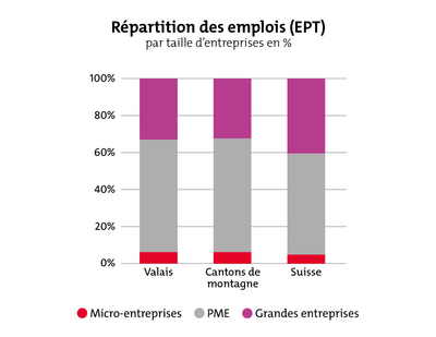 Les PME forment l'épine dorsale de l'économie suisse et valaisanne. En Valais, 61% des employés travaillent dans des PME définies comme des entreprises comptant entre 10 et 250 équivalents plein temps (EPT) ; cette part est identique à celle observée dans les cantons de montagne (62%) et supérieure à la moyenne nationale (55%). La proportion d’employés travaillant dans des grandes entreprises (plus de 250 EPT) est d’un tiers des personnes actives en Valais, comme dans les autres cantons de montagne. À l’échelle nationale, cette part atteint 41%, car une présence plus importante de sièges sociaux de grands groupes s’y trouvent. Il est notable que la part de salariés employés dans des micro-entreprises (moins de 10 EPT) est légèrement plus élevée dans le Valais et les cantons de montagne (6%) que dans l’ensemble de la Suisse (5%).