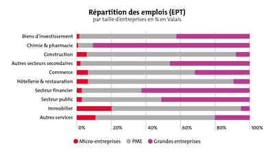 Dans le secteur secondaire, à l'exception de la construction, plus d'un tiers des personnes actives travaillent dans une grande entreprise ; les micro-entreprises n'y sont guère représentées. Dans l'industrie des biens d'investissement, 56% des travailleurs sont employés dans des petites et moyennes entreprises, 42% dans des grandes entreprises. La domination des grandes entreprises est particulièrement forte dans le secteur chimique et pharmaceutique valaisan : 91% des personnes actives y sont employées. Dans le secteur des services, en particulier en dehors des secteurs financier et public, la plupart des personnes travaillent dans une PME. Dans le commerce, 62% des employés travaillent dans des PME et près d'un tiers dans des grandes entreprises. Dans l'hôtellerie et la restauration, les PME dominent nettement : 84% des salariés y sont employés.