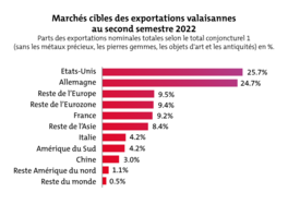 Une hausse des exportations vers la Chine (+1.0%), le reste de l'Asie (+0.9%) et le reste de la zone euro (+0.2%) a également été observée au second semestre de 2022. En revanche, une baisse a été constatée pour les exportations vers l'Amérique du Sud (-2.9%), l'Italie (-1.1%), la France (-0.2%) et l'Amérique du Nord (hors États-Unis, -0.2%). Par rapport à la même période de l'année précédente, les exportations valaisannes ont augmenté pour arriver à un total de 24.6% (CH : -0.2%).