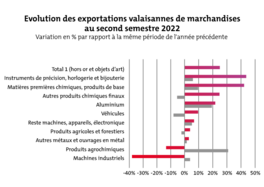 Au second semestre 2022, les exportations valaisannes de marchandises ont progressé de presque 25% par rapport à la même période de 2021. À eux seuls, les États-Unis et l’Allemagne représentent la moitié des exportations du canton. Le commerce extérieur valaisan séduit à nouveau le marché asiatique, mais est en perte de vitesse pour l’Amérique du Nord et l’Europe.
